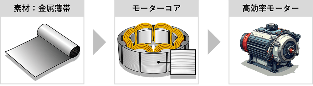 薄帯を積層して形成する磁性コアは、高周波領域での低鉄損特性を発揮し、EV、ドローン、空調室外機などに搭載されるモーターの高効率駆動に貢献しています。