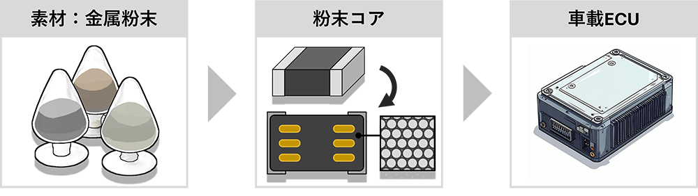 粉末コアは、粒子が絶縁された構造により渦電流が抑えられ、高周波でも安定した性能を発揮します。その特性を活かし、チップインダクタやパワーチョークとして、車載ECU、再エネインバーター、5G/IoT通信機器のノイズ対策など、広く用いられています。